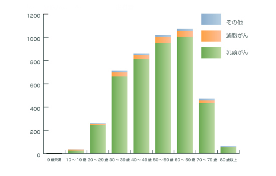 - 下の図は年齢分布です。乳頭がん、濾胞がんは比較的若い人に見られます。しかし未分化がんだけは、胃がんや肺がんなどと同じように50歳以上、とくに60歳以上の高齢層に発生します。